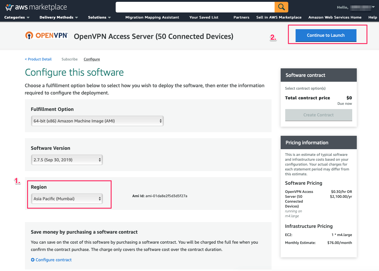 Select Region & Continue to Launch
