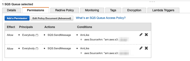 | Unable to validate the following destination configurations. Permissions on the destination queue do not allow S3 to publish notifications from this bucket. (arn:aws:sqs:REGION:AWS계정ID:세팅하려던_SQS_QUEUE_NAME) |