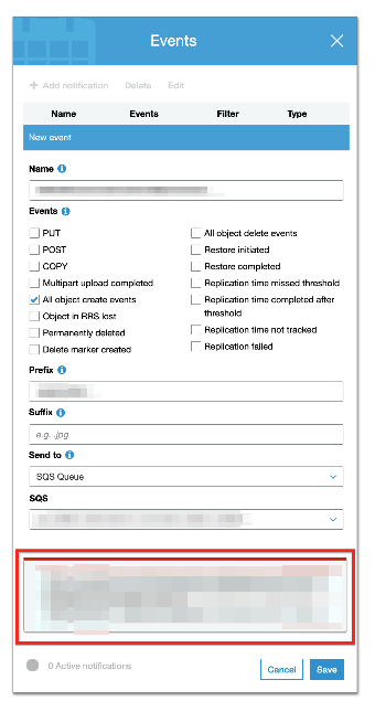 I created an SQS queue and added policy under permission tab allowing only my account users to configure the configure the notification Policy Document { "Version": "2012-10-17", "Id": "arn:...
