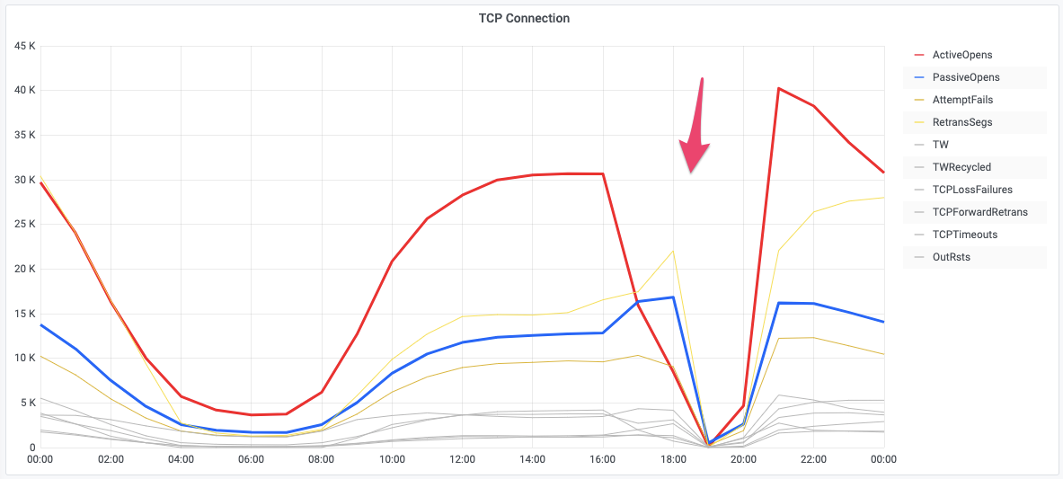 - Nginx error 발생으로 신규 TCP 연결이 급격하게 감소 (나머지 지표는 그에 따른 영향으로 감소)