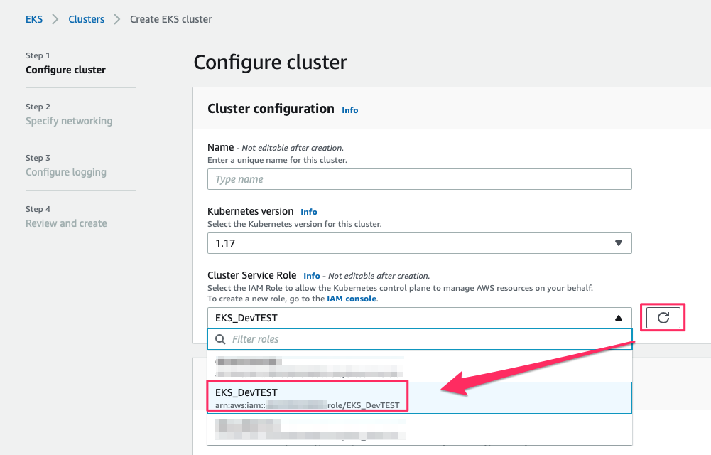 - 이후에는 EKS 메뉴로 가서 Cluster Service Role의 refresh 버튼을 누르면 보이게 되고 선택해주면 됩니다.