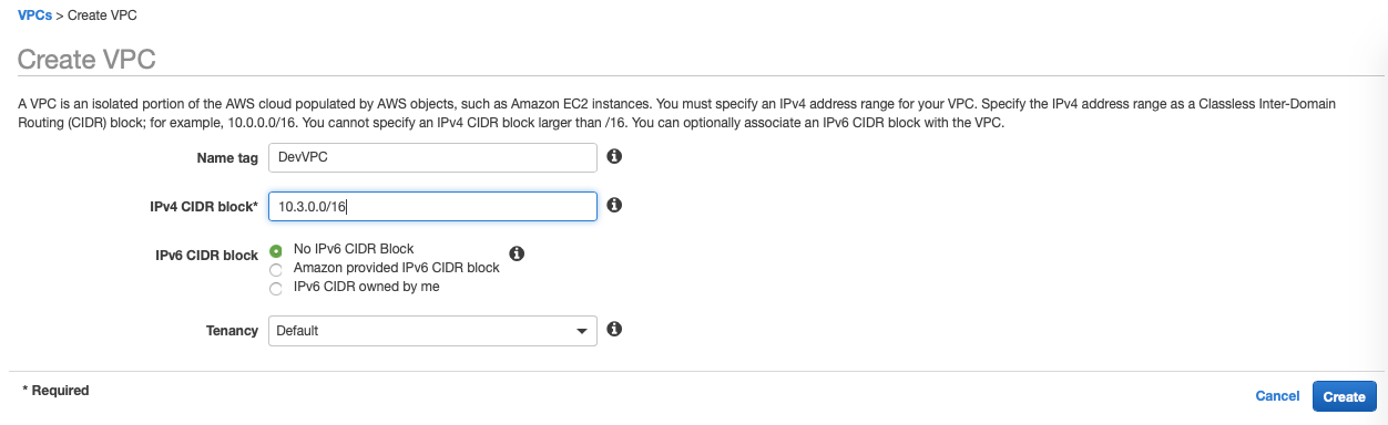 - 저는 IPv6는 사용하지 않아서 default인 No IPv6 CIDR Block을 선택했습니다.