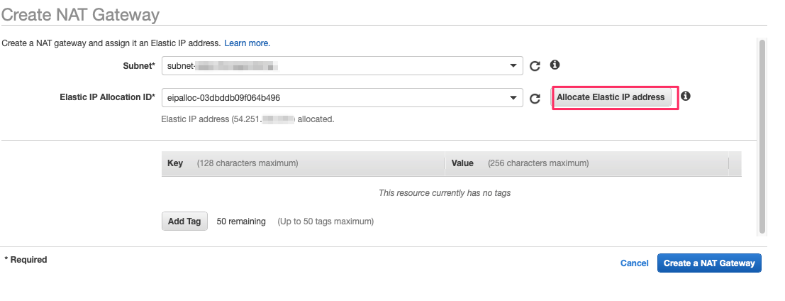 - 참고로 NAT Gateway 생성할 때는 여기에서 사용할 때는 Associate Elastic IP address를 클릭하면 알아서 EIP를 생성해서 할당해줍니다.
