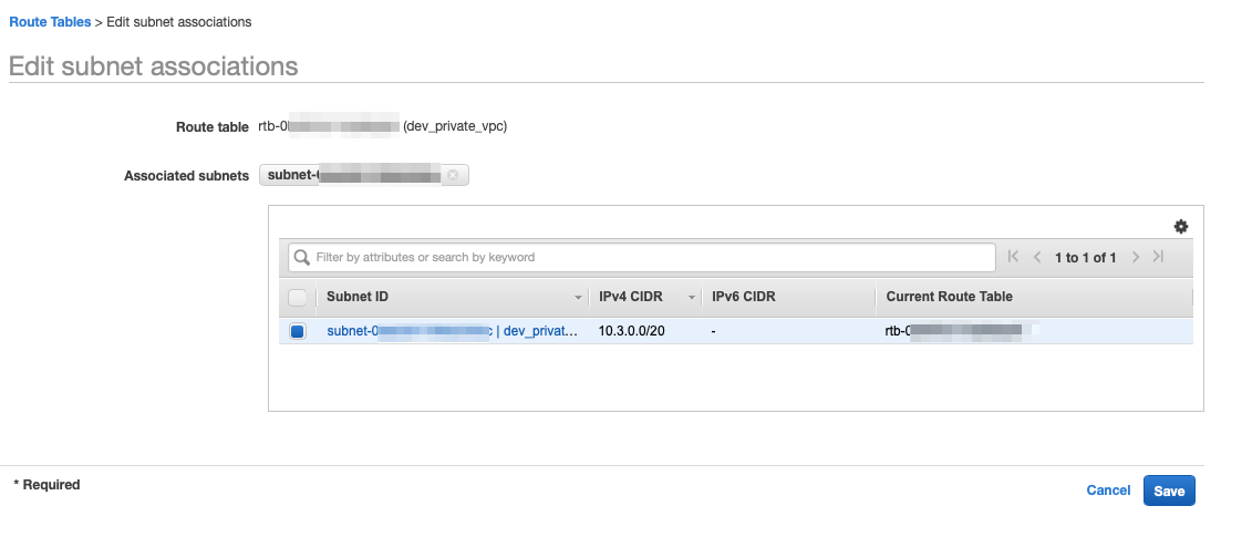 클릭하고 들어간 후에 할당해줄 subnet을 선택하고 서로 Associate시켜 줍니다.