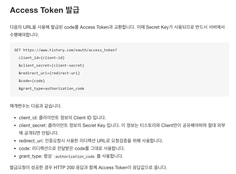 www.tistory.com/oauth/access_token?client_id=나의 CLIENT_IDc&client_secret=나의 CLIENT_SECRET&redirect_uri=설정한 redirect uri &code=2번과정에서 받아온 code 정보&grant_type=authorization_code