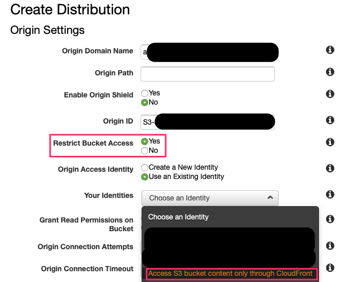 CloudFront와 S3를 이용해서 서빙을 한다면 처음 세팅할때 이 부분을 반드시 "Yes"로 해주고 Identity는 Access S3 bucket content only through CloudFront를 선택한다.