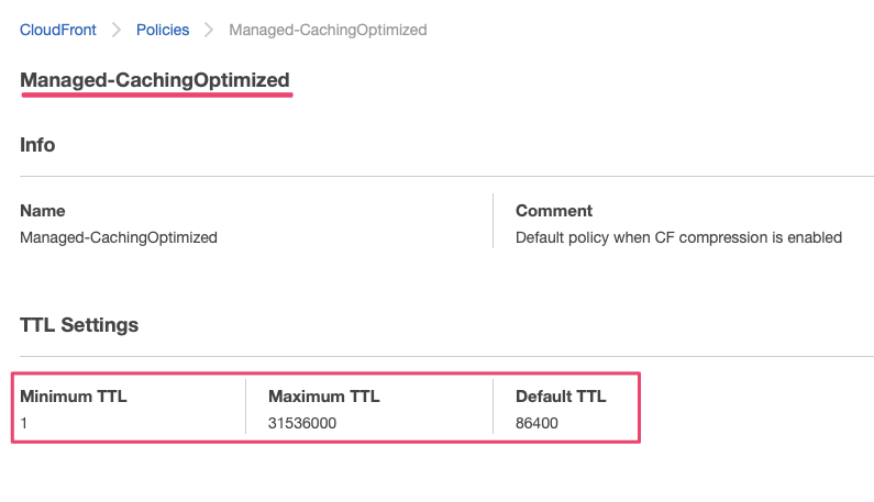 그럼 다시 Cloudfront로 돌아와서 Cache policies 중에 "Managed-CachingOptimized"의 TTL 세팅을 다시 본다.
