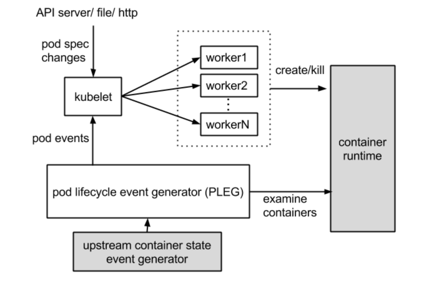 Pod를 주기적으로 polling 하는 작업의 오버헤드를 줄이기 위해 PLEG (Pod Lifecycle Event Generator)를 사용한다