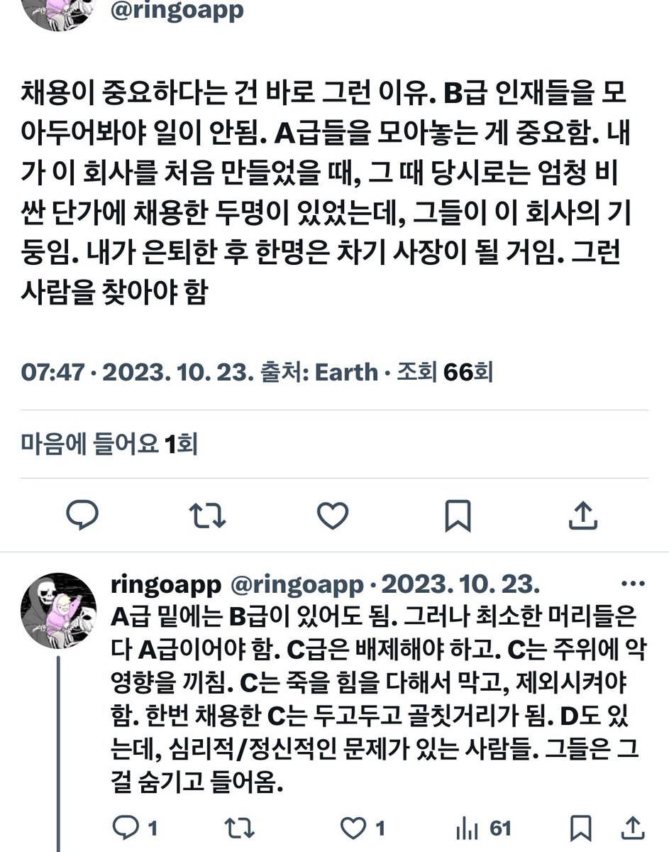 중간인력(B급) 모아봐야 일이 안되고 고급인력(A급)만 모아야 한다.
