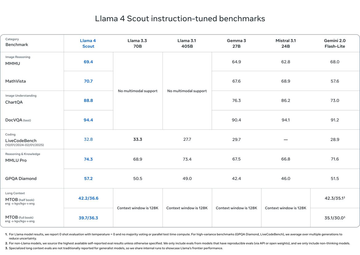 1. Llama 4 Scout: 17B 활성 파라미터와 16개 전문가로 구성된 모델로, 총 109B 파라미터를 보유하고 있습니다. Int4 양자화를 사용하면 단일 H100 GPU에서 실행 가능합니다. 10M 토큰의 업계 최고 컨텍스트 길이를 지원합니다. (👉 머지않아 기존 RAG 사업들 다 박살 나겠다 🤢 왜? 기존의 RAG가 “외부에서 정보를 검색해 요약한 뒤 LLM에 전달”하던 과정이 불필요해짐. 예전에는 모델이 긴 문서를 한 번에 다 읽지 못했기 때문에 RAG로 필요한 부분만 추출해서 전달해야 했지만, 이제는 그냥 전부 넣어도 되는 모델이 나옴)