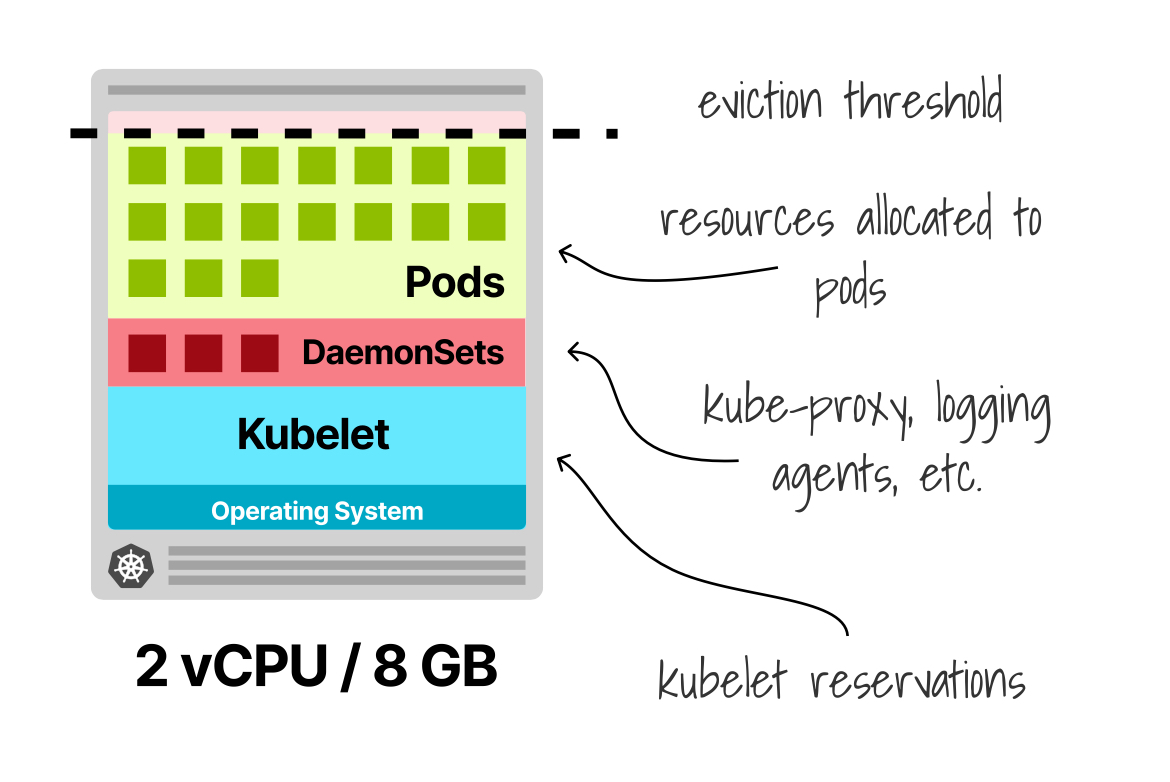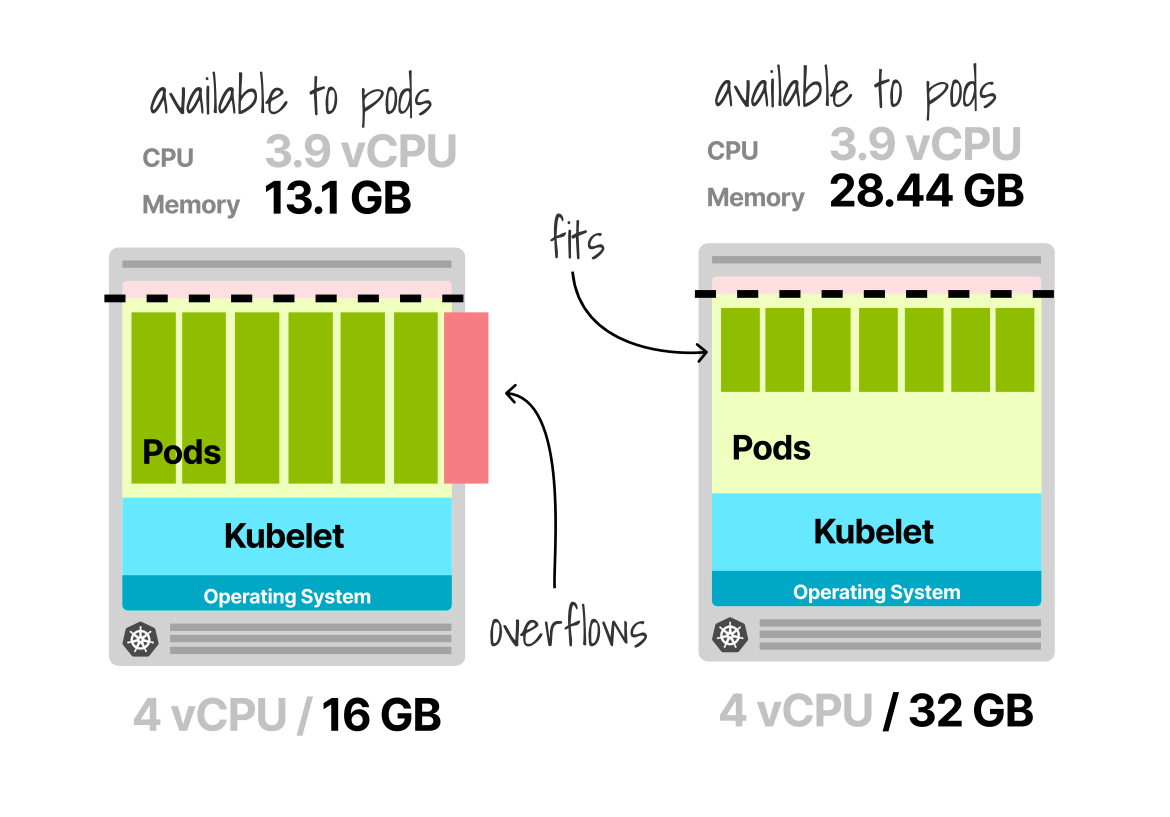 이는 전체 메모리의 약 75%만 워크로드 실행에 사용됨을 의미합니다. 게다가 Kube-proxy, Fluentd, NodeLocal DNSCache 같은 DaemonSet도 노드 크기에 관계없이 리소스를 소비합니다.