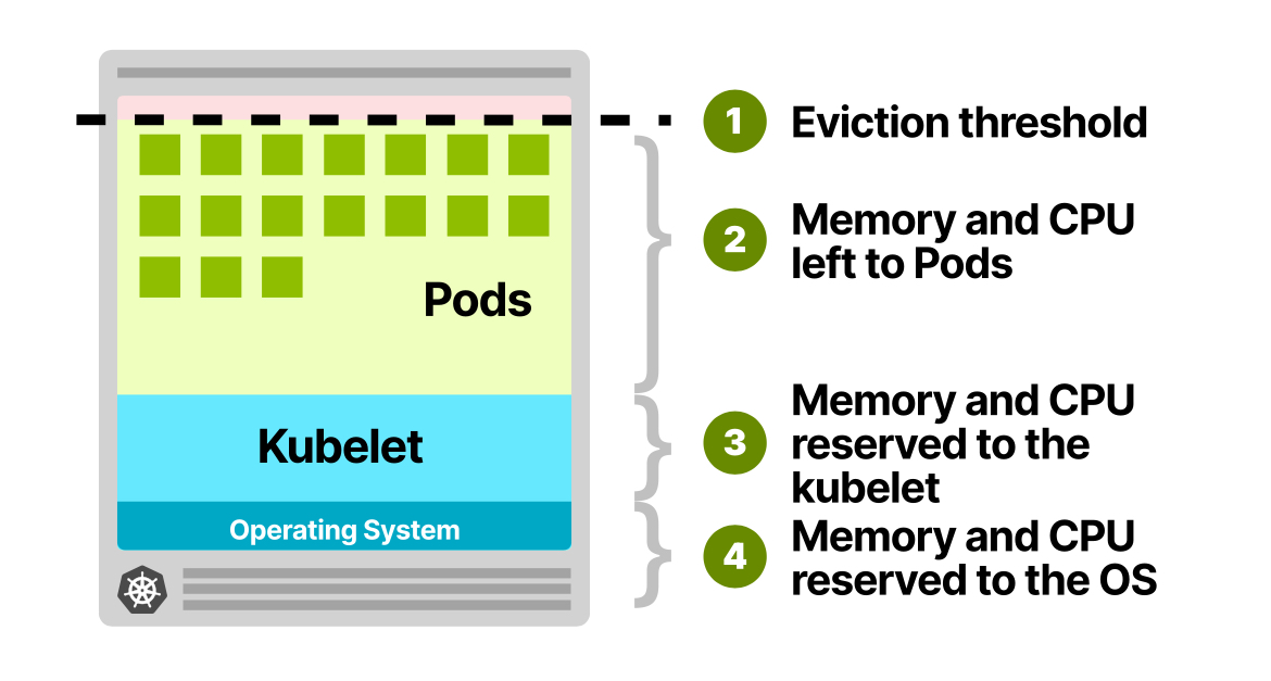 각 워커 노드는 kubelet(쿠버네티스 에이전트)을 실행하는 컴퓨팅 유닛입니다. kubelet, SystemD, 운영 체제는 모두 리소스를 필요로 하기 때문에 워커 노드의 모든 리소스가 파드 실행에 사용 가능한 것은 아닙니다.