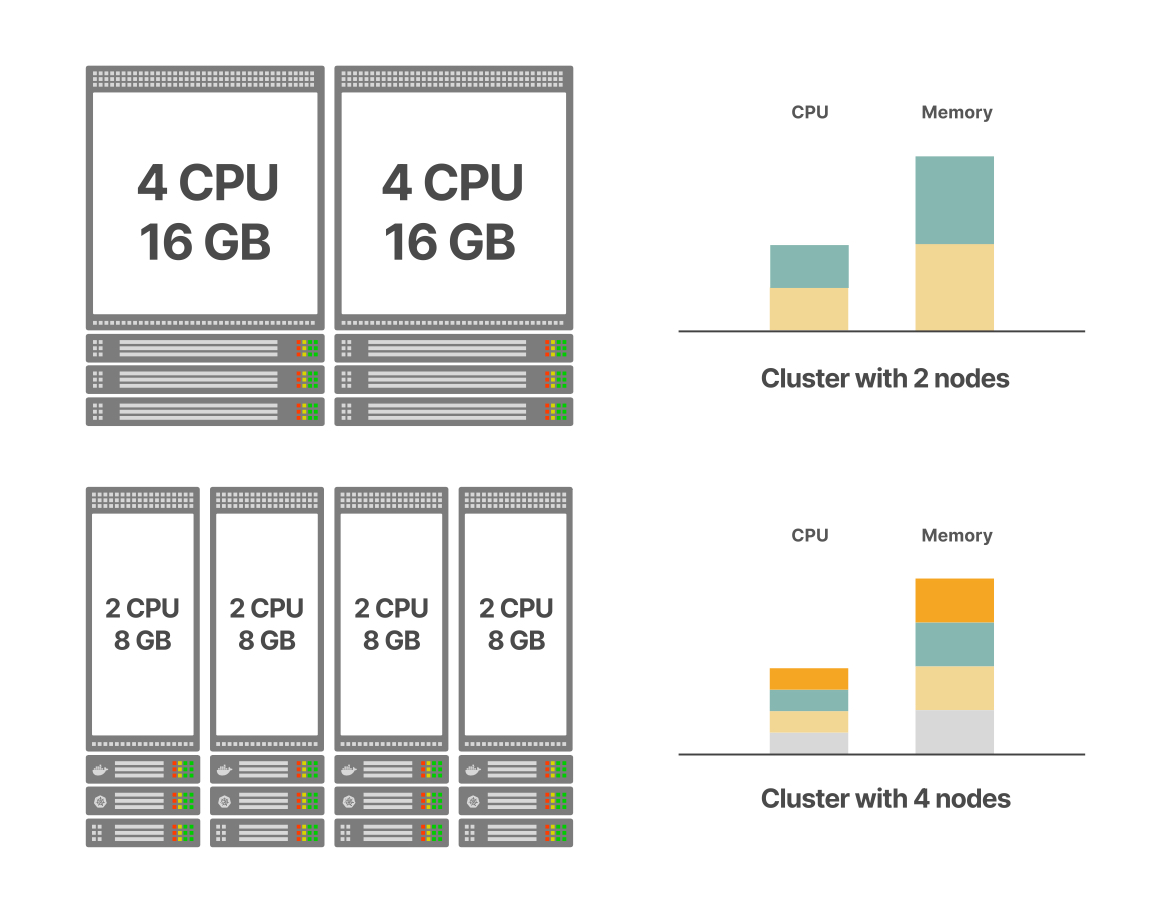 쿠버네티스 클러스터는 개별 노드들을 하나의 큰 "슈퍼 노드"로 추상화합니다. 이 슈퍼 노드의 총 컴퓨팅 용량(CPU와 메모리)은 모든 구성 노드 용량의 합계입니다. 예를 들어, 총 8 CPU 코어와 32GB RAM이 필요한 클러스터를 구성할 때: